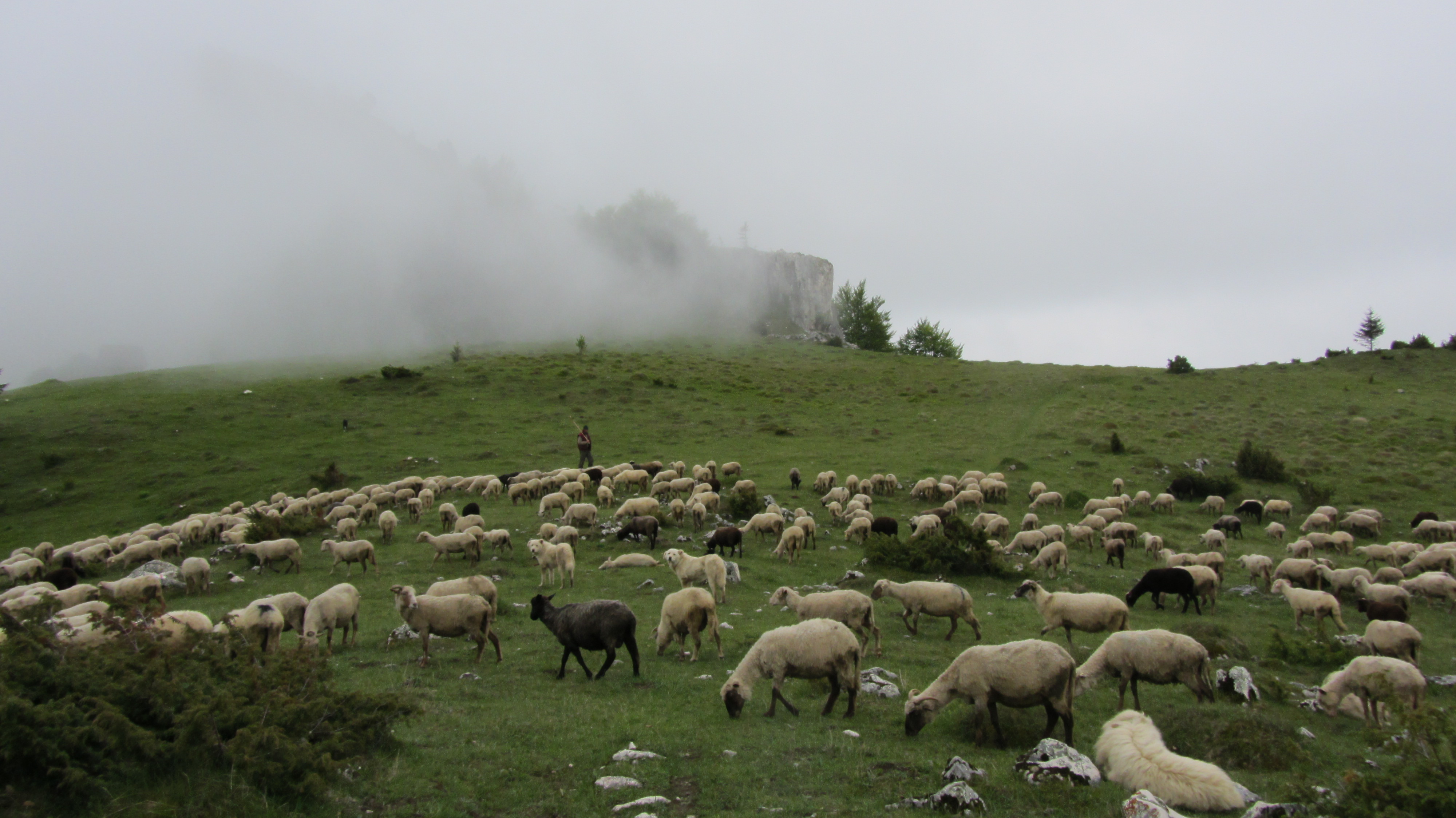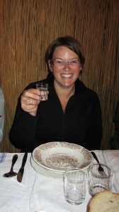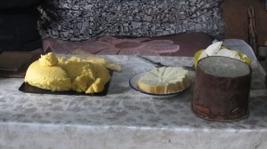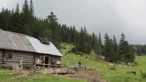 The walking was really quite difficult at times but I’m glad we did it. On our last day we had a difficult mountain climb up to a shepherds’ summer camp. When we arrived they were skinning a calf which had died overnight. The summer camps are essentially a rectangular, 3-roomed, wooden hut with earthen floor. In the main room a large fire-pit is constructed in the floor to service a large cauldron for boiling milk for cheese and cooking. Outside a fence is erected to pen the stock overnight and the shepherds sleep outside with them, their rather vicious guard dogs keeping watch for predators – wolves and bears. A dangerous job.