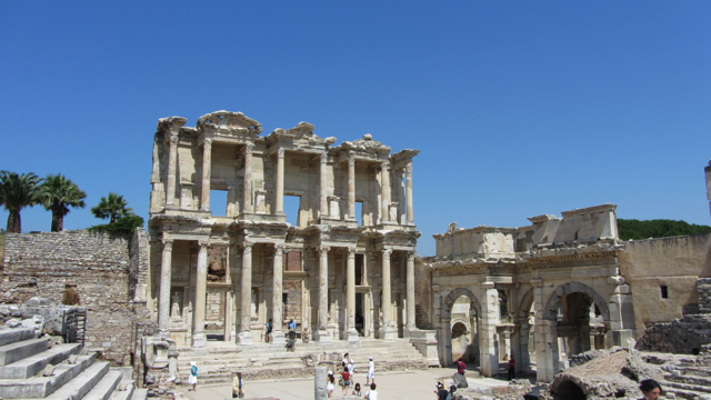 Passing by various temples, fountains and water pipes we arrived at the Hercules Gate and the beginning of Curetes St (so named for the statues of Curetes – Priests – at the foot of the colonnades). This wide road of marble extends past some of the Ephesian highlights: public baths, public latrines, terraced housing, Trajan’s temple and fountain, to the carefully reconstructed Library of Celsus and Gate of Mazeus and Mithraidates.