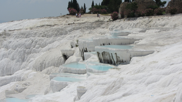 The site’s administrators have wisely cordoned off a pristine section of pools for viewers to see the crisp whiteness of the calcium deposits and luminous aqua colour of the water; a surreal effect one would expect to see from a master potter and glazer.